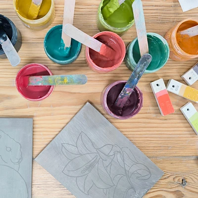 - Após uma breve introdução e demonstração, cada participante trabalha um a dois azulejos , aplicando a técnica de esgrafitado sobre a superfície já preparada com engobe.