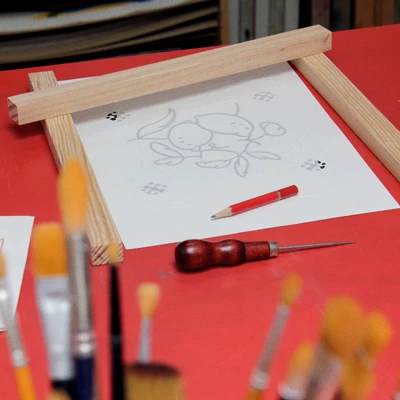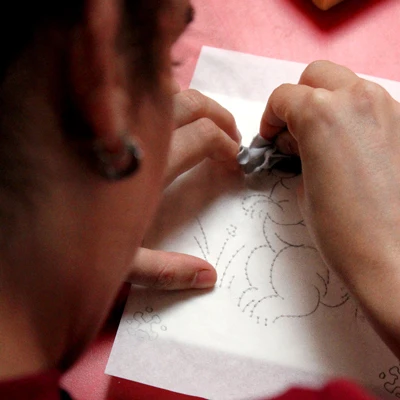 - Técnicas tradicionais de transposição para o azulejo, estresido (papel vegetal picotado e boneca de carvão).