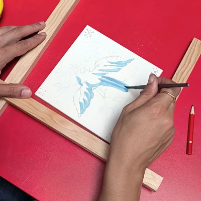 - Cada participante pinta um ou dois azulejos, aplicando as técnicas apresentadas e explorando livremente desenho, cor e composição.